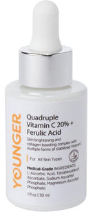 Introducing our Quadruple Vitamin C 20% + Ferulic Acid serum, the ultimate skin brightening and boosting solution. This powerful serum contains multiple forms of Vitamin C, including L-ascorbic acid, magnesium ascorbyl phospate, tetrahexyldecyl ascorbate, and sodium ascorbyl phosphate, to provide maximum amount of antioxidants and visibly brighten. Ferulic acid further enhances the serum's brightening properties by helping to stabilize Vitamin C and increase its efficacy. With regular use, this serum will leave your skin looking brighter, smoother, and more radiant than ever before. 1 fl. oz